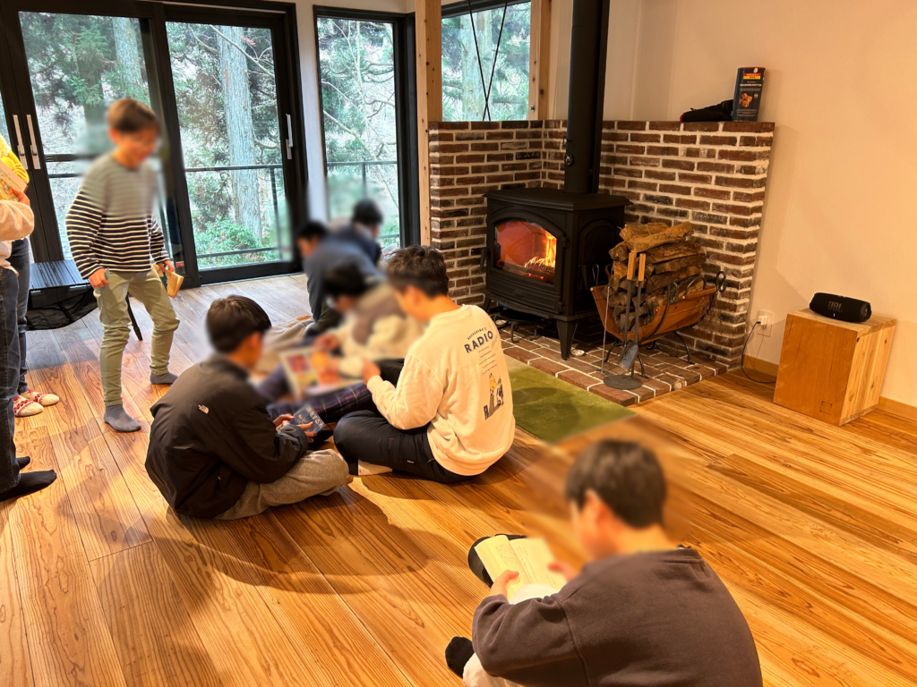 薪ストーブの前で温まりながら読んだり、床に寝転がって読んだり、木の椅子を運んで読んだり、、、
