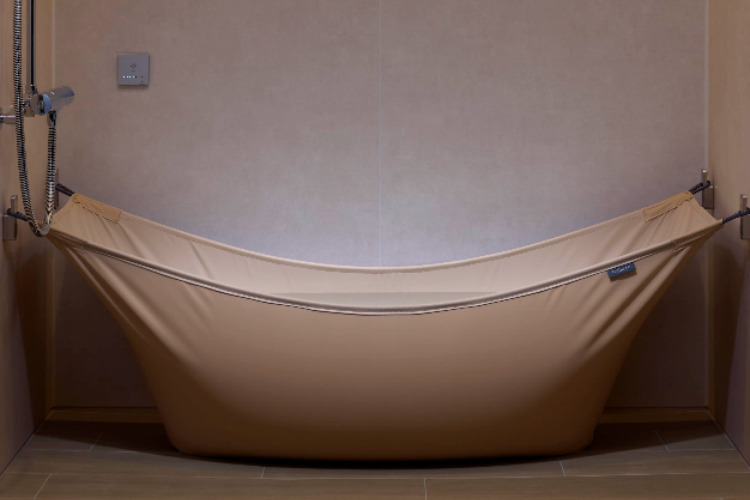 素材は柔らかい織物と防水フィルムの複層構造。湯をためると両側のエッジロープが張り、浴槽底面は床に接していて身体をしっかり支えるため、安定して入浴できます。使用しない時は簡単に折りたたんで収納可能。シャワー浴と浴槽浴を使い分ける、自由なお風呂をご提案します。