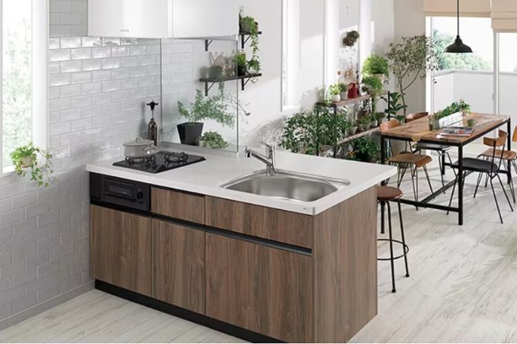 戸建住宅で人気の「アイランド型・ペニンシュラ型キッチン」の機能性とデザイン性は維持しながら、賃貸住宅でも設置可能なサイズに仕上がっています。